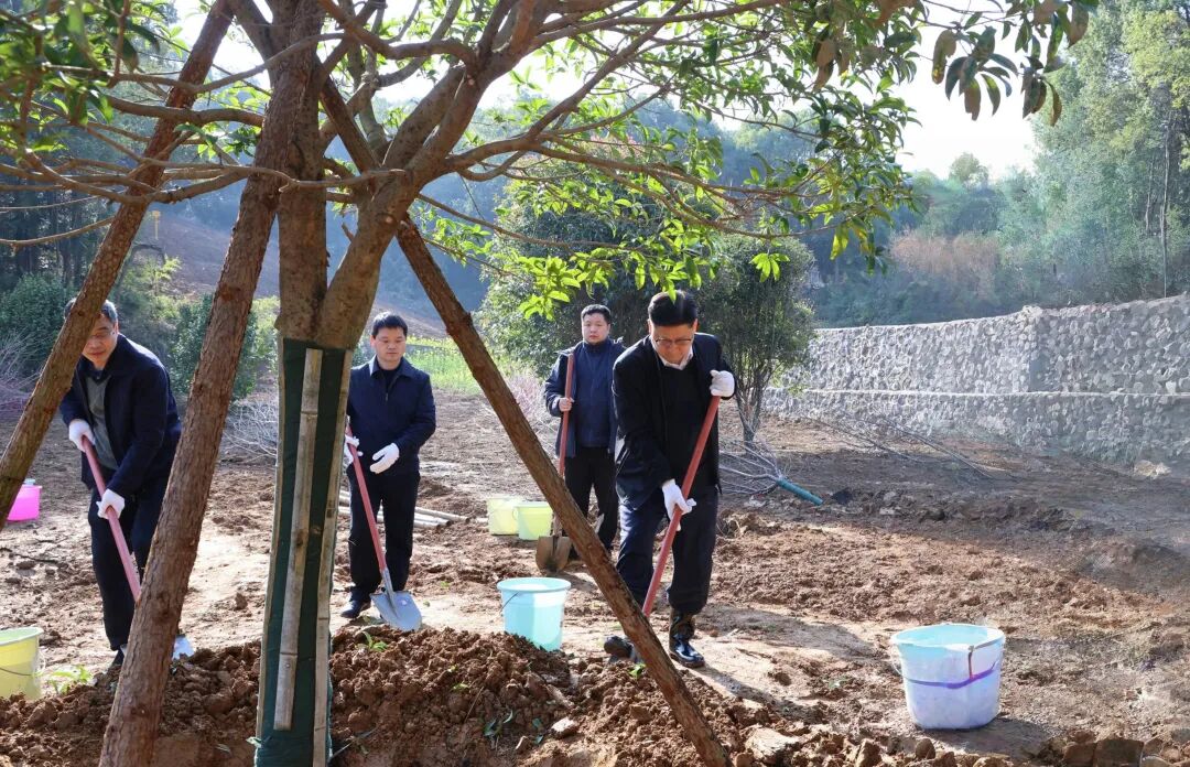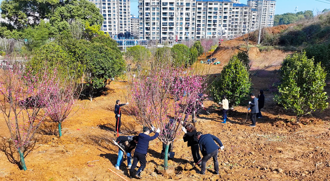 植树现场,赵和平等领导同干部群众一道,拿起工具挥锹铲土、扶苗培土、夯土压实,大家分工协作、相互配合,现场一片热火朝天的景象。经过一番努力,桂花、红梅、金枝槐、樱花、茶花等90余株苗木挺拔树立,为濂溪生态再添一片新绿。